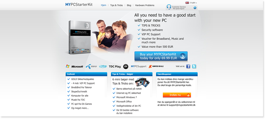 Is totally unique and the first of its kind. It is a complete compilation and offering all you need for your new PC. Within MYPCStaterkit´s trusted partners are Microsoft, Skype, EA Games, TDC, Google, MYPCSupport and many more. It’s a product which is a must for all people buying a new PC and it is widely distributed by the largest electronic retail chains throughout the words where many of them actually give it away as a free add-on to the PC.