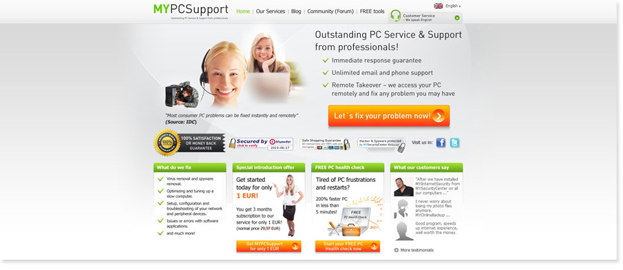 Is offering professional technical remote service and support to all private and small office customers. We fix PC, Internet, software, hardware as well as peripheral product problems people might have. We offer immediate and unlimited email, phone and “Remote-Takeover” service, support and assistance in your own language.